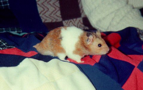 Paul was our first hamster, adopted from my friend Ian Chai, when he was about 6 months old (Paul, not Ian). Paul was the second of six hamsters that found their way into Ian's household. These were Barnabas, Paul, Silas, Timothy, Aquila, and Bob. [By the way, Aquila was adopted as one of a pair. The other hamster, who lived with a friend of Ian, was female; guess what her name was -- it's in the Bible.] Anyway, as of late 1993, Barnabas, Paul, and Timothy were living together in a sizable cage. Barney was a teddybear, Paul was a seriously overweight brown-and-white banded, and Timmy was a baby golden. I nicknamed them "Fluffy", "Tubbo", and "Junior".