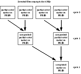 Both versions of VolRender follow the basic design outlined in previous sections of this paper, with minor differences. With respect to compositing the partially completed raster images, an inverted binary tree method (Figure 3) and a tiling method (Figure 4) were examined. The tiling approach is intuitively appropriate, as it keeps all processing elements working on the problem until the final image is completed. Note that during the first cycle, PE 0 composites tile 0 on PE 1 with its tile 0, while PE 1 composites tile 1 on PE 2 with its tile 1, and so on. This staggered approach eliminates memory contention. However at each of the n-1 cycles, n messages are sent across the network (each PE must receive one message). With this level of traffic, network contention becomes a severe concern. Conversely, the inverted tree approach requires that at most n/2 messages will occupy the network in any cycle, but during latter cycles a majority of the processing elements are idle. For 8 or fewer PEs, there is no discernible difference between the compositing times for the two approaches. As the number of PEs increases, the tiling approach is superior.