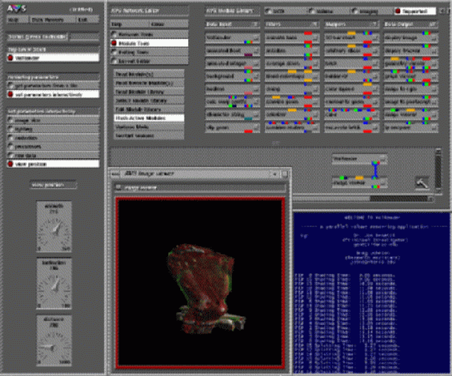 The GUI is written in C, with the application framework provided by the data flow visualization system AVS. Assembling the interface with AVS allows for a rapid prototyping design model and reduces development time by allocating widget communication and mouse event handling tasks to the AVS kernel. The fact that no T3D version of AVS exists, combined with dependency of the Cray T3D on a host system for external IO support, implies a distributed application architecture in which the interface runs under AVS on the Cray T3D host system while the volume processing engine resides on the T3D itself.