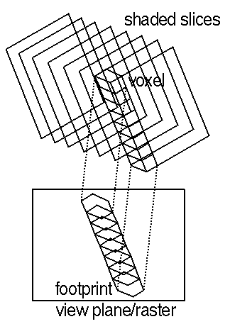Once all of the voxels have been shaded, there is a set of shaded slices that form the volume. There are many ways to produce an image from these slices and VolRender currently uses the "splatting" method [9] (see [5] for an analysis of direct volume rendering algorithms on the Cray T3D). Splatting is accomplished by projecting each voxel onto the view plane in a front-to-back traversal with respect to the view plane as shown in Figure 3. With a parallel projection, the footprint (or projection) of a voxel on the view plane will be constant for all voxels. Since a voxel will not project onto exactly one pixel, a filter is used to spread out the color and transparency to neighboring pixels.