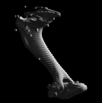The purpose of the shading algorithm is to simulate lighting and is based on the Phong reflection model [4]. This model requires a surface normal and is calculated by examining the densities of the neighboring voxels. For voxel D(i,j,k), an approximate surface normal is calculated by N(i,j,k) = (D(i-1,j,k) - D(i+1,j,k), D(i,j-1,k) - D(i,j+1,k), D(i,j,k-1) - D(i,j,k+1)). A large difference between neighboring voxels indicates a high likelihood of a surface passing through that voxel. A small difference implies that the voxel is in an area of homogeneous mass and the transparency of that voxel will be increased. This is done so "boring" areas will become invisible and "interesting" areas are highlighted. Since this is not a binary decision like that used to produce a polygonal model with marching cubes [7], it produces a more accurate image with more information in it.