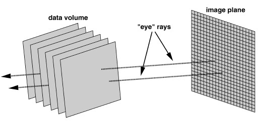 Figure 1: Raycasting works by casting virtual rays through the data volume, one per pixel in the image plane. The volume is sampled at unit increments along the ray. These samples are combined to determine the color and opacity of the corresponding pixel. |