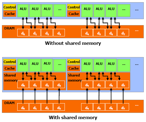 each multiprocessor has a small dedicated memory (16KB). They are called shared