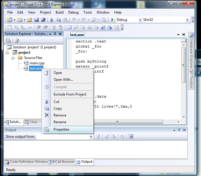 directly from Microsoft (400MB). Visual C++ has a pretty nice inline assembly syntax, but for big chunks of assembly it's easier to use NASM, the Netwide Assembler. Here's how to use NASM from Visual C++ 2008:
